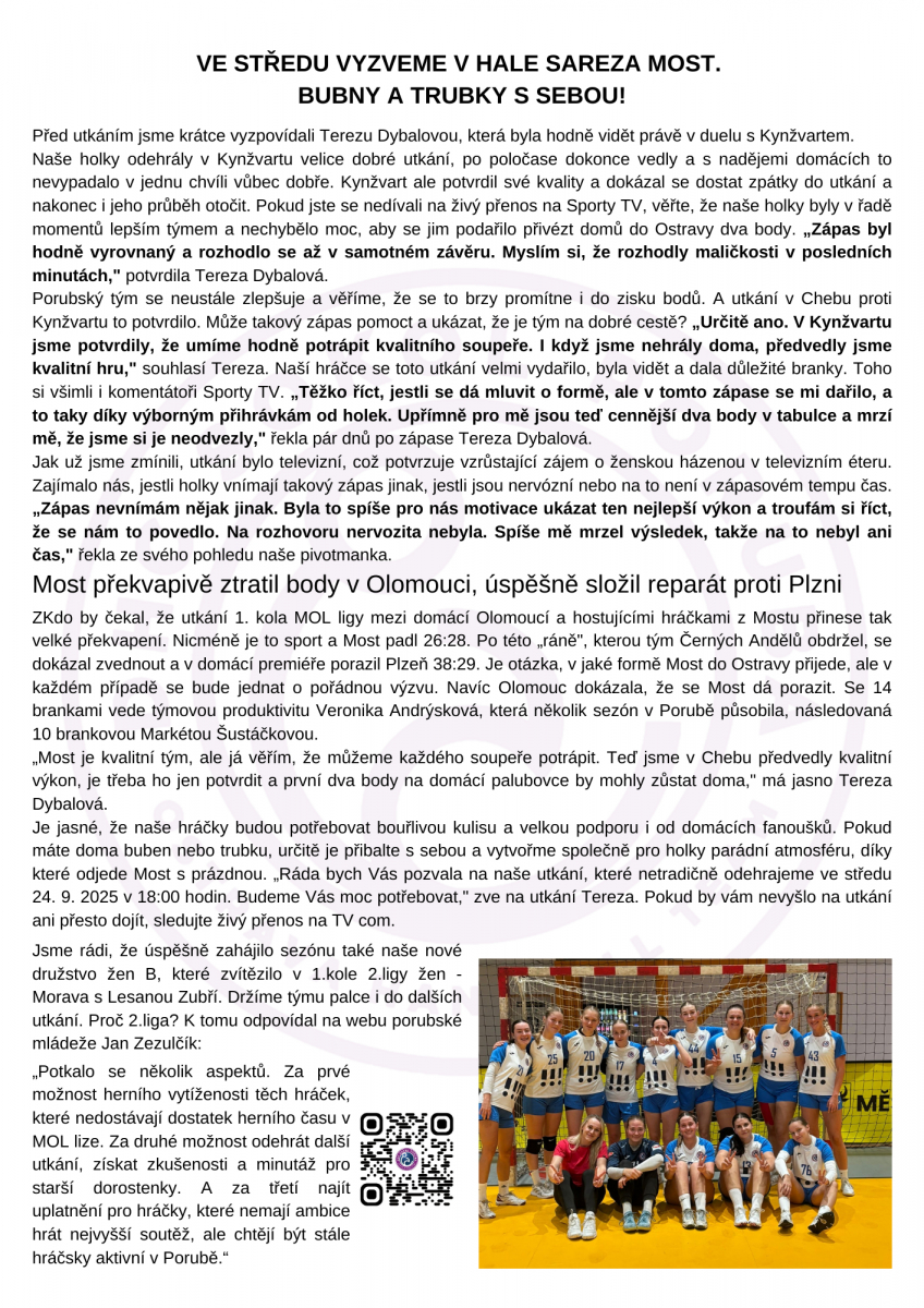 Je jasné, že naše hráčky budou potřebovat bouřlivou kulisu a velkou podporu i od domácích fanoušků. Pokud máte doma buben nebo trubku, určitě je přibalte s sebou a vytvořme společně pro holky parádní atmosféru, díky které odjede Most s prázdnou. „Ráda bych Vás pozvala na naše utkání, které netradičně odehrajeme ve středu 24. 9. 2025 v 18:00 hodin. Budeme Vás moc potřebovat," zve na utkání Tereza. Pokud by vám nevyšlo na utkání ani přesto dojít, sledujte živý přenos na TV com. Odkaz ZDE.