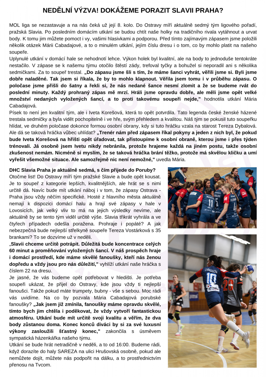 Je jasné, že vás budeme opět potřebovat v hledišti. Je potřeba soupeři ukázat, že přijel do Ostravy, kde jsou vždy ti nejlepší fanoušci. Takže pokud máte trumpety, bubny - vše s sebou. Moc rádi vás uvidíme. Na co by pozvala Mária Cabadajová porubské fanoušky? „Jak jsem již zmínila, fanoušky máme opravdu skvělé, tímto bych jim chtěla i poděkovat, že vždy vytvoří fantastickou atmosféru. Utkání bude mít určitě svoji kvalitu a věřím, že dva body zůstanou doma. Konec konců diváci by si za své luxusní výkony zasloužili šťastný konec," zakončila s úsměvem sympatická házenkářka našeho týmu.