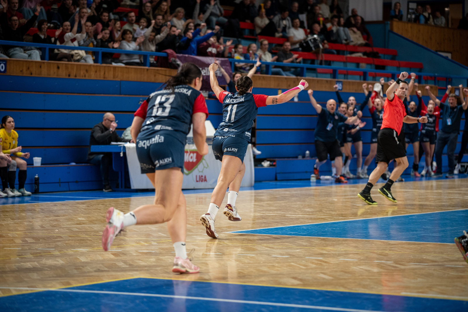 A nyní k průběhu samotného utkání. To před zaplněnou Sarezou bylo specifické pro naši odchovankyni Kláru Ulmanovou, která nyní hraje za Zlín. První střela utkání šla právě z její ruky, ale Páťa Wizurová byla připravena, s Klárou se přece jen znají od žákovských let. První gól vsítila porubská Anežka Farářová po faulu na ni samotnou. Z následného útoku pak srovnala z pravého křídla Polomíková. Následně čarovaly brankářky na obou stranách a další branka padla až po několika minutách a opět z pravého křídla, tentokrát ale z ruky naší hráčky Káji Vachtarčíkové. Porubanky se dále mohly spolehnout na Páťu v bráně a přidaly další branky (4:1, 5:2). Zlín ale zpřesnil hru, brzy srovnal a dokonce otočil skóre na 5:7. To si bral time out náš trenér Petr Mazur. Naše holky srovnaly (7:7), ale Zlín opět po souhrách spojek s křídly nebo pivotem navýšil své vedení na 7:10. Posledních pět minut první půle pak bylo na branky o dost bohatší a do šaten se šlo za remízového stavu (13:13).