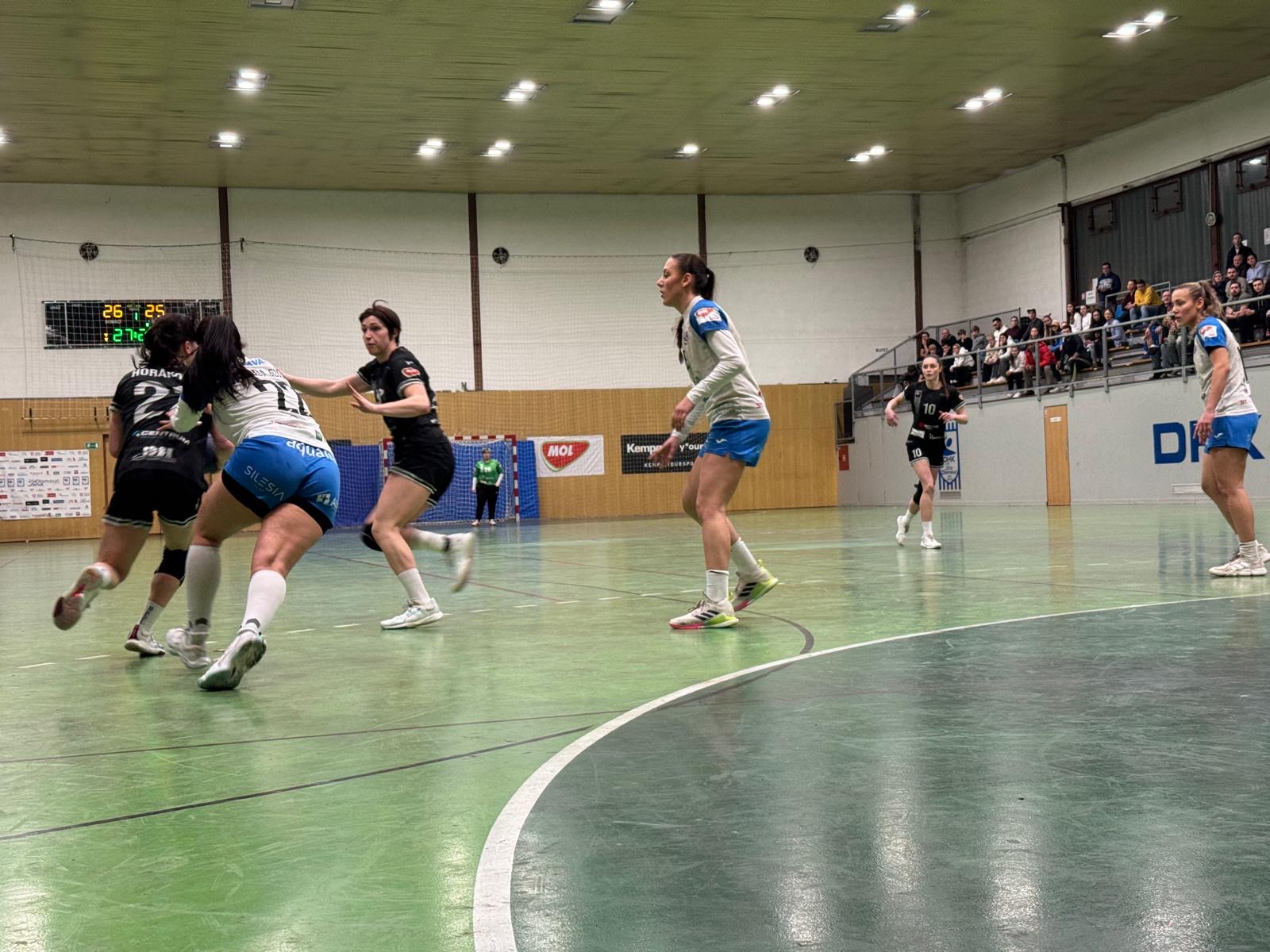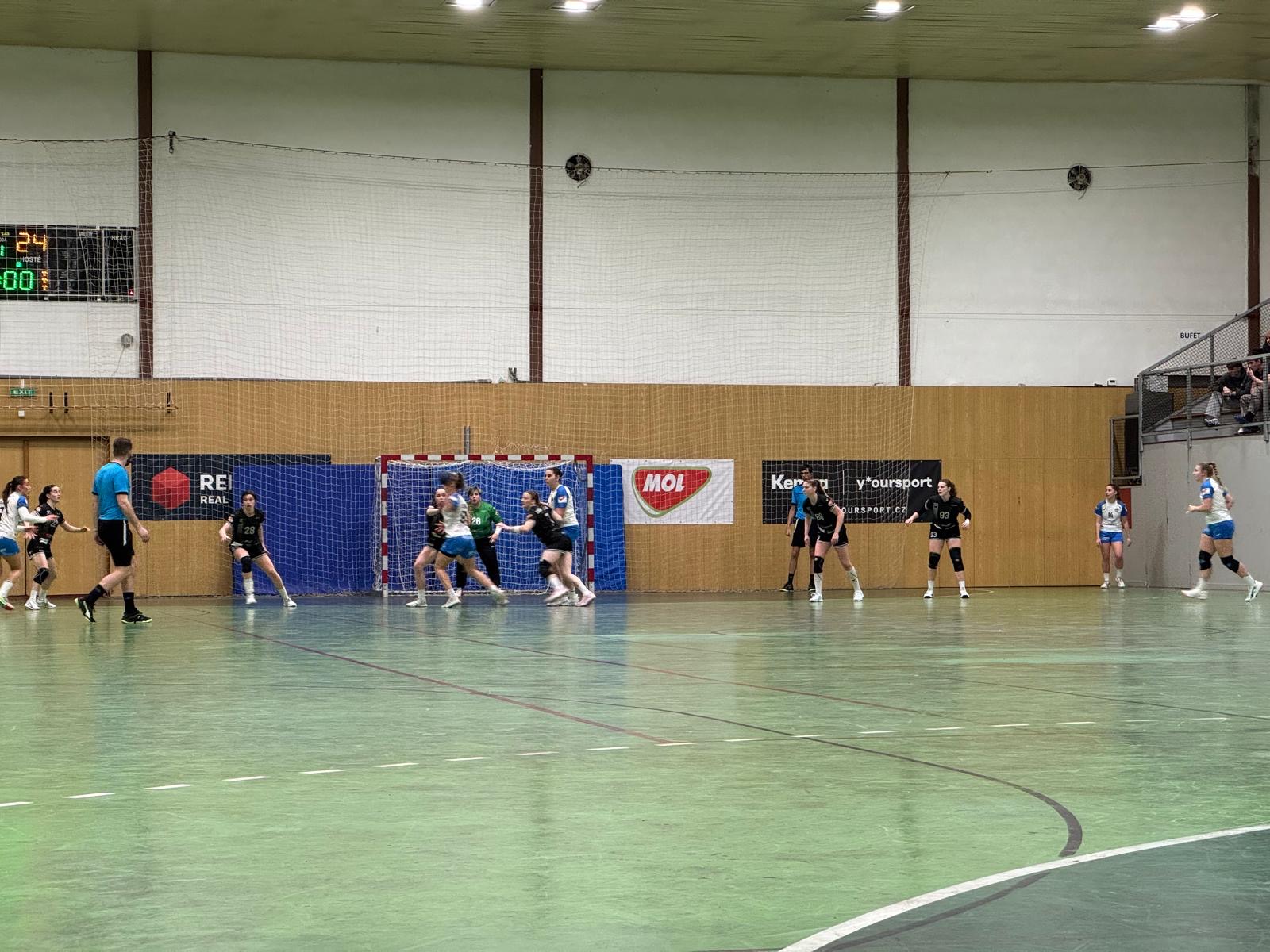 Do Olomouce jely holky s touhou po bodech. Bohužel začátek utkání se jim moc nepovedl. Technické chyby, nepřesné střely a také vyloučení Lujzy Čižmárikové znamenalo vedení Olomouce 5:1 a 7:2. To už si vzal trenér Mazur time out. Následně se hra našich uklidnila, góly jsme byli schopni střílet ze všech postů a fungovala obrana se skvěle chytající Páťou Wizurovou. Co nás stále malinko limitovalo bylo zakončení. Každopádně jsme se dotáhli na rozdíl jedné branky (12:11) ve 26.minutě. Bohužel se nám nepovedl samotný závěr a domácí odskočili do posledního hvizdu první půle na 14:11.