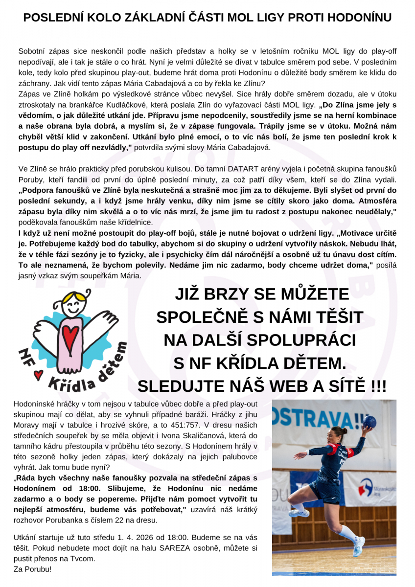 Sobotní zápas sice neskončil podle našich představ a holky se v letošním ročníku MOL ligy do play-off nepodívají, ale i tak je stále o co hrát. Nyní je velmi důležité se dívat v tabulce směrem pod sebe. V posledním kole, tedy kolo před skupinou play-out, budeme hrát doma proti Hodonínu o důležité body směrem ke klidu do záchrany. Jak vidí tento zápas Mária Cabadajová a co by řekla ke Zlínu?