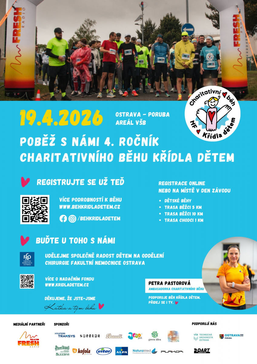 Co ještě dodat závěrem? Snad je pozvánku na tuto krásnou akci, kterou chce podpořit i náš klub. A to svou aktivní účastí. Určitě se do areálu VŠB v Porubě zajděte podívat nebo se nejlépe registrujte na tento běh. „Rádi bychom všechny srdečně pozvali na 4. ročník charitativního běhu Křídla dětem, který se uskuteční v neděli 19. dubna 2026 v areálu VŠB - Technické univerzity Ostrava v Porubě. Připraveny jsou tratě pro děti i dospělé - dětské běhy, 5 km, 10 km i kilometrová trasa pro chodce. Přijďte si zasportovat, užít si příjemnou atmosféru a zároveň pomoci dobré věci. Každý krok pomáhá dětem, které to opravdu potřebují. Děkujeme," dodává závěrem s úsměvem na tváři Monika Struminská.